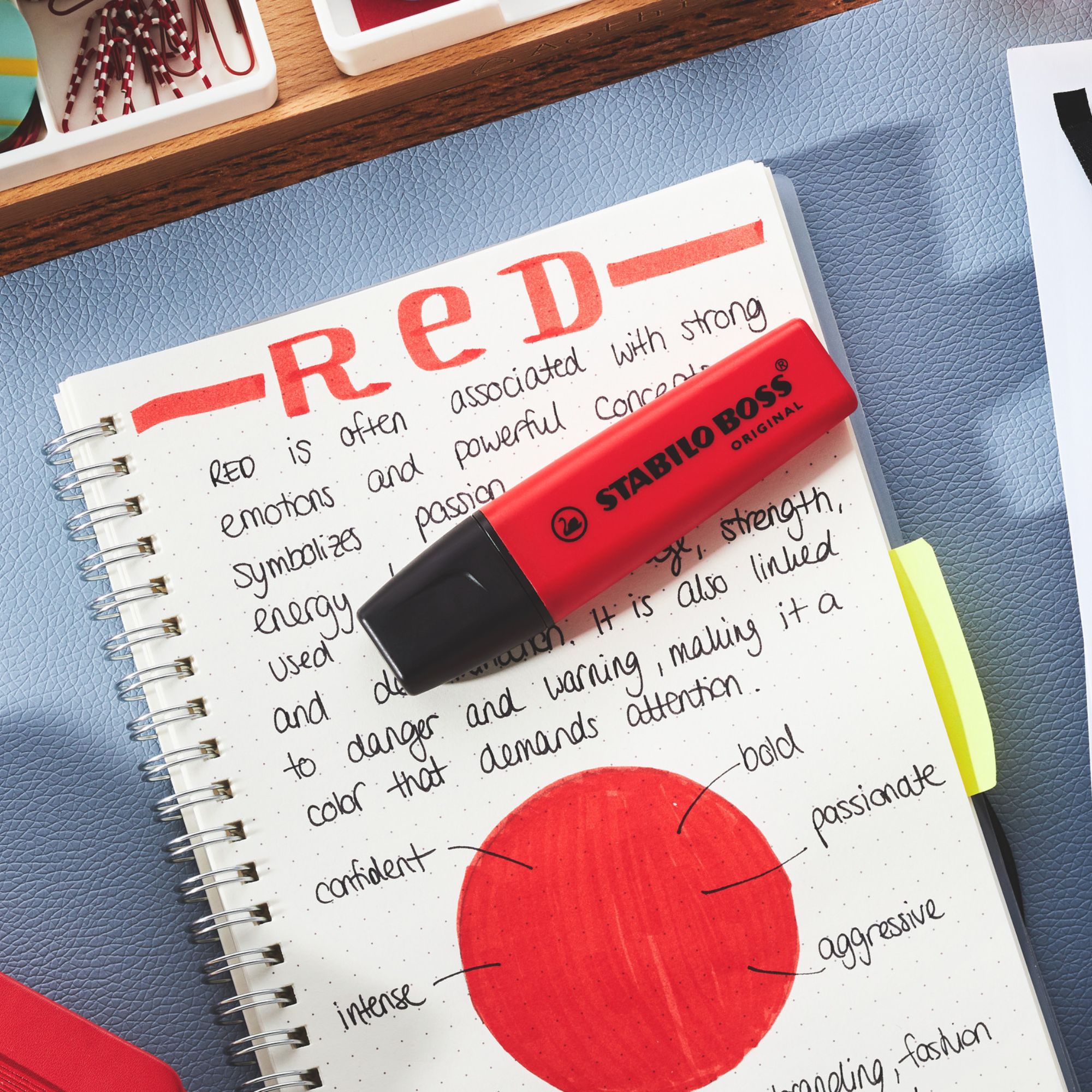 A Stabilo highlighter in red has been a strong request by the creative community – The Stabilo Boss Original RealRed is the answer. The vibrant red highlighter stands out on its own and makes structuring notes easier than ever. The red ink instantly draws attention to what has been highlighted.